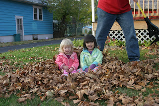 Sunday afternoon, daddy decided it was time for the girls to play in the leaves. They ran and jumped into the leaves. I think their favorite part was the leaf shower. Daddy must have showered them about 10 times. The leaves were going everywhere.